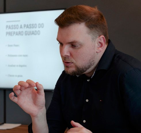 No máximo dois profissionais por turma. Esse modelo reduzido garante atenção personalizada, acompanhamento próximo e espaço para troca direta com o Dr. Roger durante todo o processo.